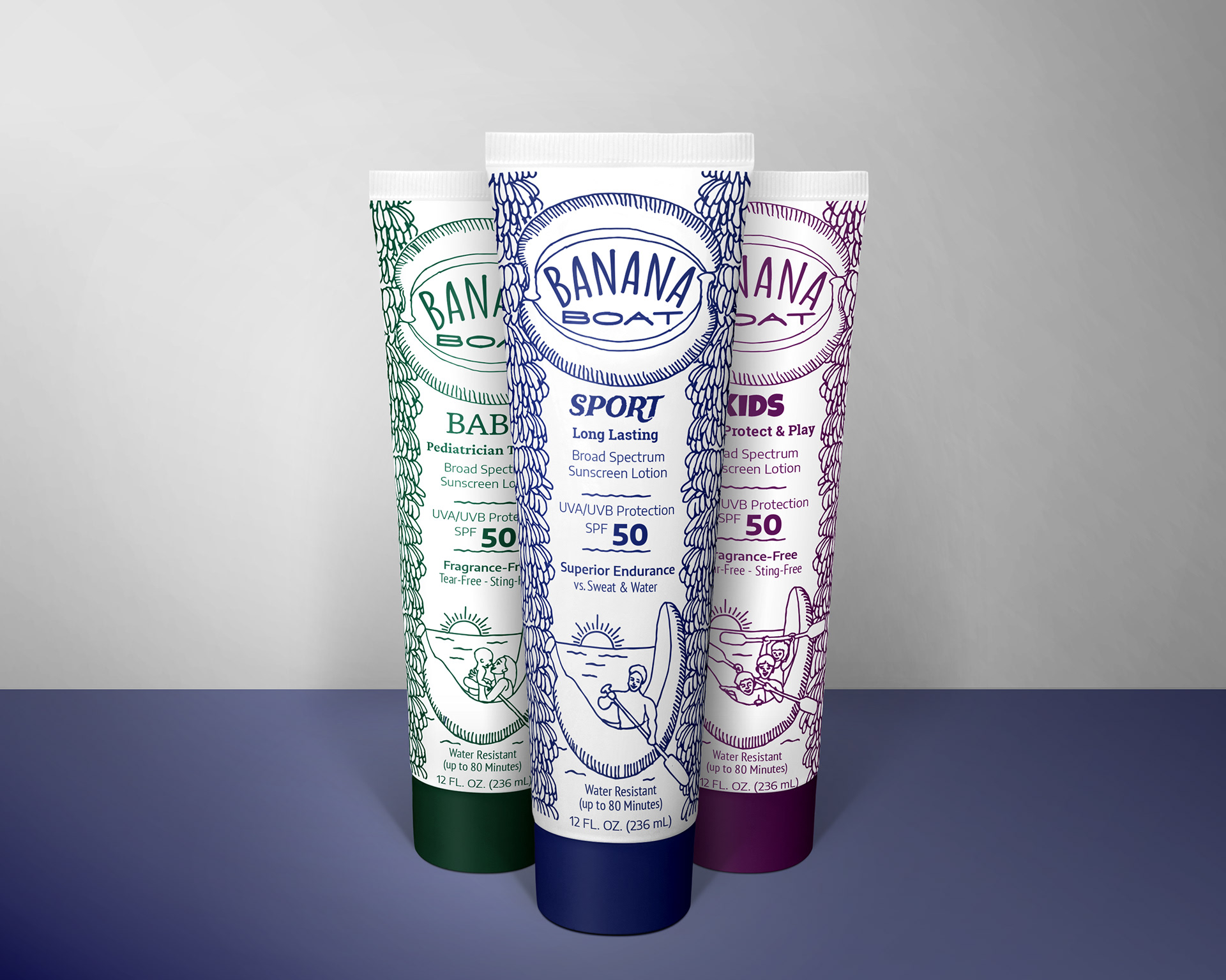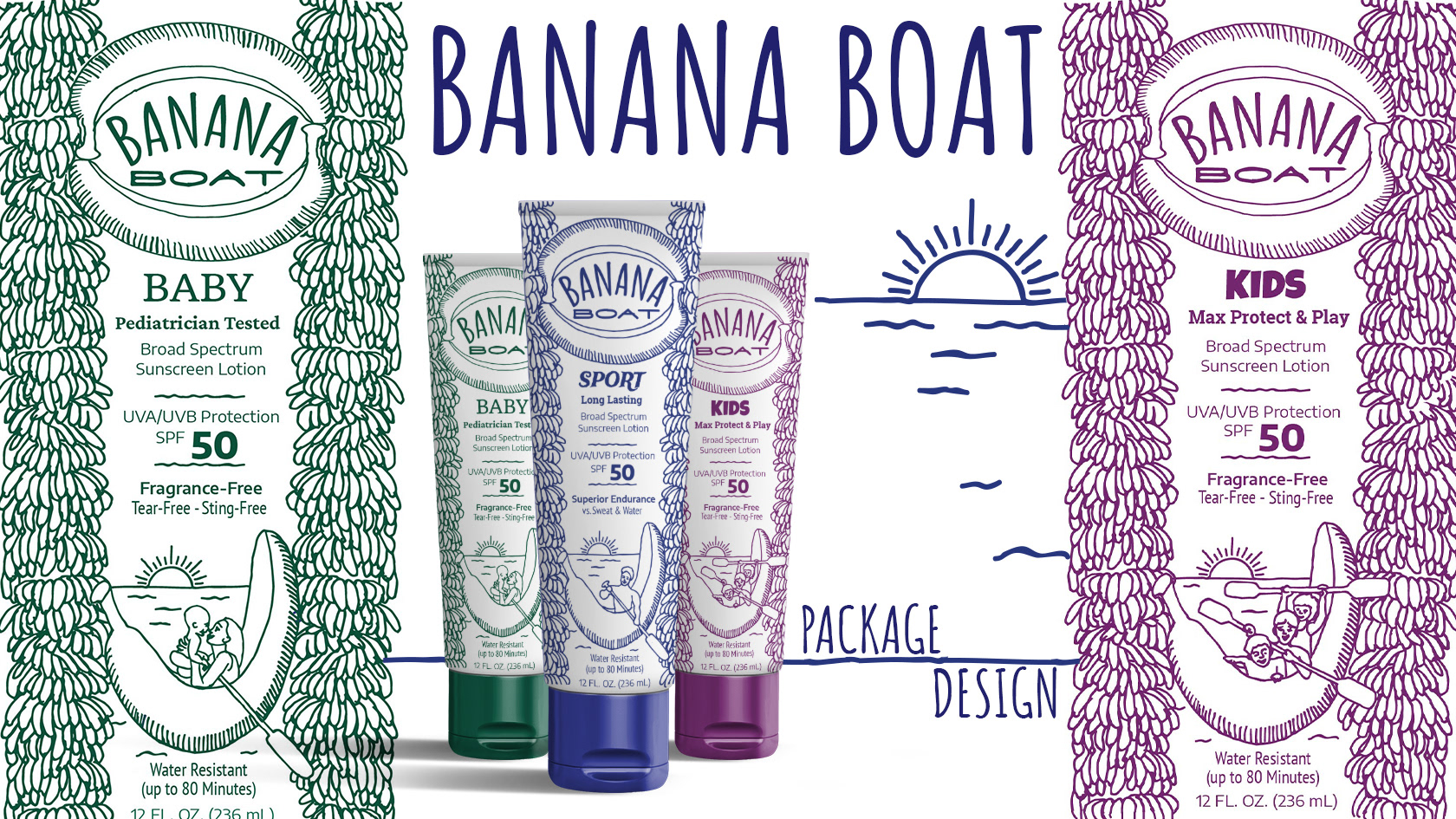 Banana Boat sunscreen lotion has been clinically proven to protect skin of people of all ages under a variety of special conditions as with high activity level playing sports, or when active near the water boating, or at the beach. Robert Bell originally developed the product in 1981 and it’s packaging hadn’t changed much since then, making it a prime candidate for a redesign. Playful hand drawn illustrations give the new packaging a more natural, less clinical feel. The new design also highlights different variations of the product: Sunscreen for Babies, Kids, and Sports in a way to unify the brands visual identity, featuring similarly styled images of different subject matter. Special consideration given to typography helps hold a lot of information in a relatively small space with a less crowded appearance.